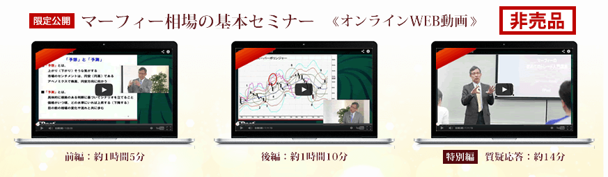 大感謝キャンペーンの期間内にマスタースクール(DVD)をご購入された方にプレゼントいたします。内容は、FX初心者用に行った「相場の基本セミナー」というもの(オンライン動画)ですが、任運自在なトレーダーになるためのヒント・テクニックが数多く教えられているセミナー動画です。セミナー参加者からの興味深い質問とそれに対する具体的かつ実践的な返答内容は、今すぐに見ていただきたいものです。下のタイマーが切れる前に、マスタースクール(DVD)をお申込みいただいた方のみが見られる希少な動画です。