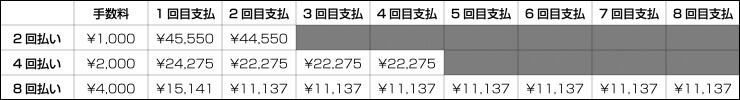 | 手数料 | 1回目支払 | 2回目支払 | 3回目支払 | 4回目支払 | 5回目支払 | 6回目支払 | 7回目支払 | 8回目支払 | |